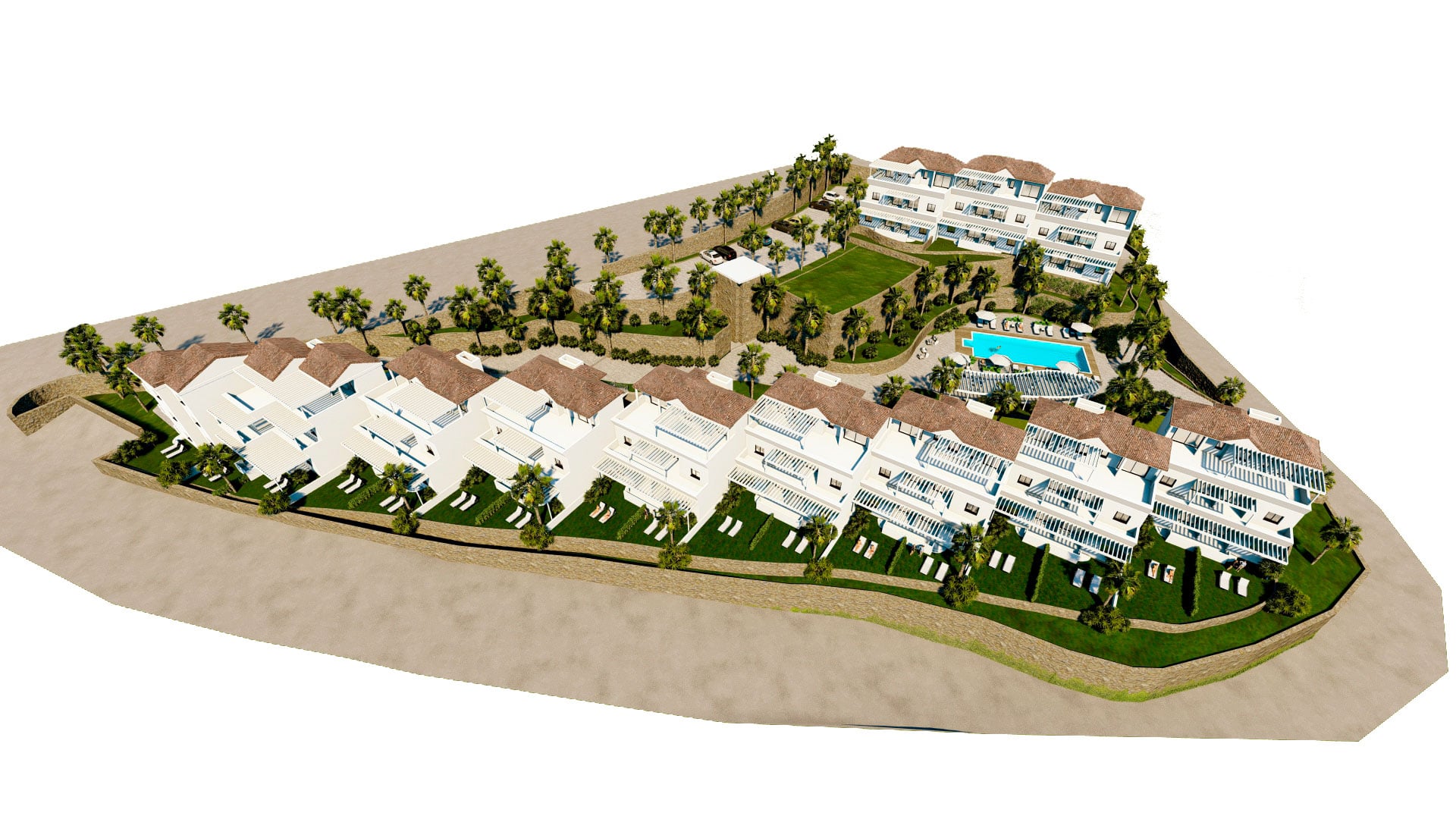 Zona residencial destinada a 58 apartamentos turísticos de 2 llaves en Av. del Mediterráneo en la línea de la concepción. Actualmente, el inmueble se encuentra en fase de reforma, adaptación y terminación. Consta de una superficie total de suelo de 8.230,00m2 y de una superficie construida de 4.927,13m2 distribuida en 3 plantas sobre rasante y 2 plantas en sótano con trasteros y garajes. Cuenta con grandes zonas ajardinadas y piscina comunitaria.